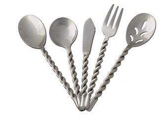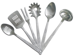 2 Spoons, Pasta Server, One Ladle, One Flipper/spatula, and one fork all engraved. 18/0 Stainless